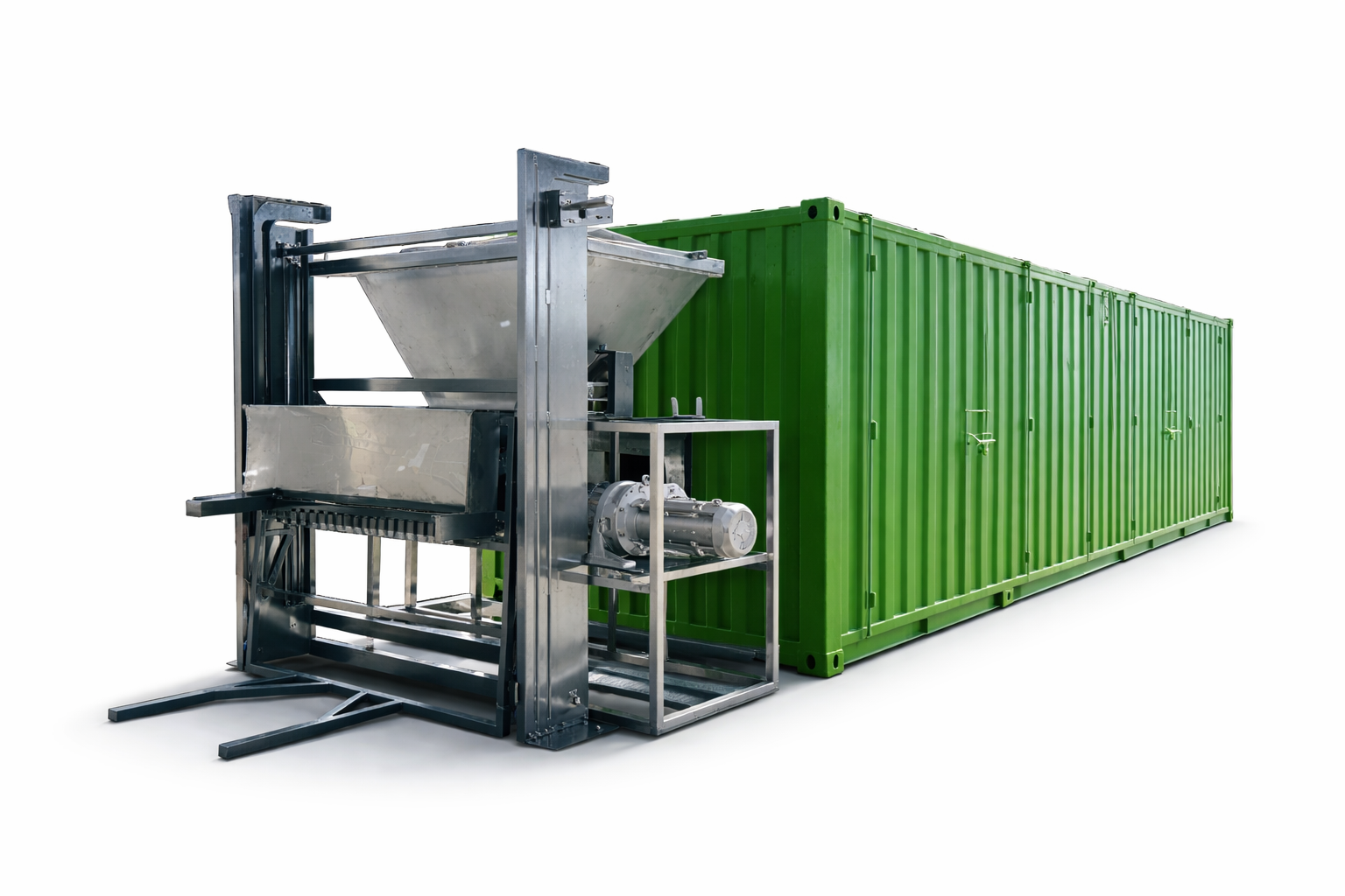 Modular Solid Waste Recycling. Processes various non-recyclable waste types, including plastics, food wastes, single-use foof containers, and discarded packaging materials, to produce organic compost or refuse-derived fuel (RDF) which can be used as an alternative to fossil fuels in cement kilns, power plants, and industrial boilers. This solution does not require segregation and reduces landfill waste, decreases fossil fuel consumption, and lowers CO₂ emissions.